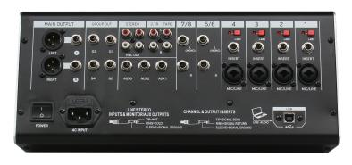 1、輸入通道:4路平衡式XLR、TRS復合卡儂麥克風輸入通道,2組4路TRS立體聲輸入通道,2組4路RCA立體聲輸入通道 2、麥克風輸入通道:4路平衡式XLR、TRS復合卡儂麥克風輸入接口 3、立體聲TRS輸入:2組4路TRS立體聲輸通道 4、立體聲蓮花輸入:2組4路RCA立體聲輸入通道 5、錄音輸出:2組4路RCA立體聲錄音輸出通道 6、幻象電源:內(nèi)置48V幻想電源供電,每通道帶獨立開關 7、低切濾波器:4路單聲道平衡式XLR麥克風輸入設有100Hz,18dB/倍頻程斜率低切濾波器開關